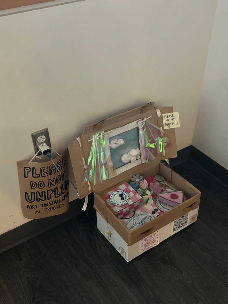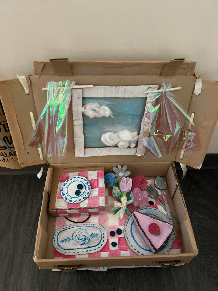 The Sculptural element is made with cardboard, ribbon, paint, hot glue for keeping pieces together, as well as cellophane. It is a picnic basket with dishes inside, utensils, a piece of cake, blueberries, and a bouquet. To create dimension she utilized cardboard to build dimension and shape. To hide the electronic part, she created an extra part that is raised as a box to place the Arduino along with the radio board.