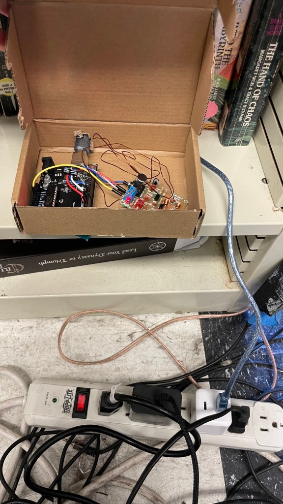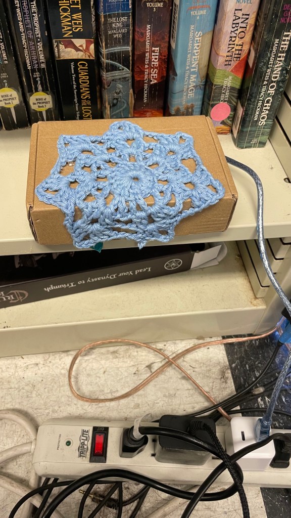 This project is based on the feeling of being caught in a spider web. It’s familiar for us students, as assignment deadlines and exam dates get closer and closer, as if they are spiders looming over we who are stuck in the web of time. For the audio, I chose to repeat a sequence of ascending notes, increasing in tempo and building up tension with every iteration. This parallels the stress we may feel before an important due date, stress accumulating with every passing day while we are paralyzed into procrastination. The radio station is placed in a box covered in a crocheted oily that resembles a web. Creating it put me in a bit of a paradoxical position, being both the “spider” crocheting the web, and the prey of the deadline to complete it. Spider Web is located in Darkstar library, a small, almost hidden library in the Student Center that I myself have only recently discovered, and sometimes reminds of an attic where a spider might reside.