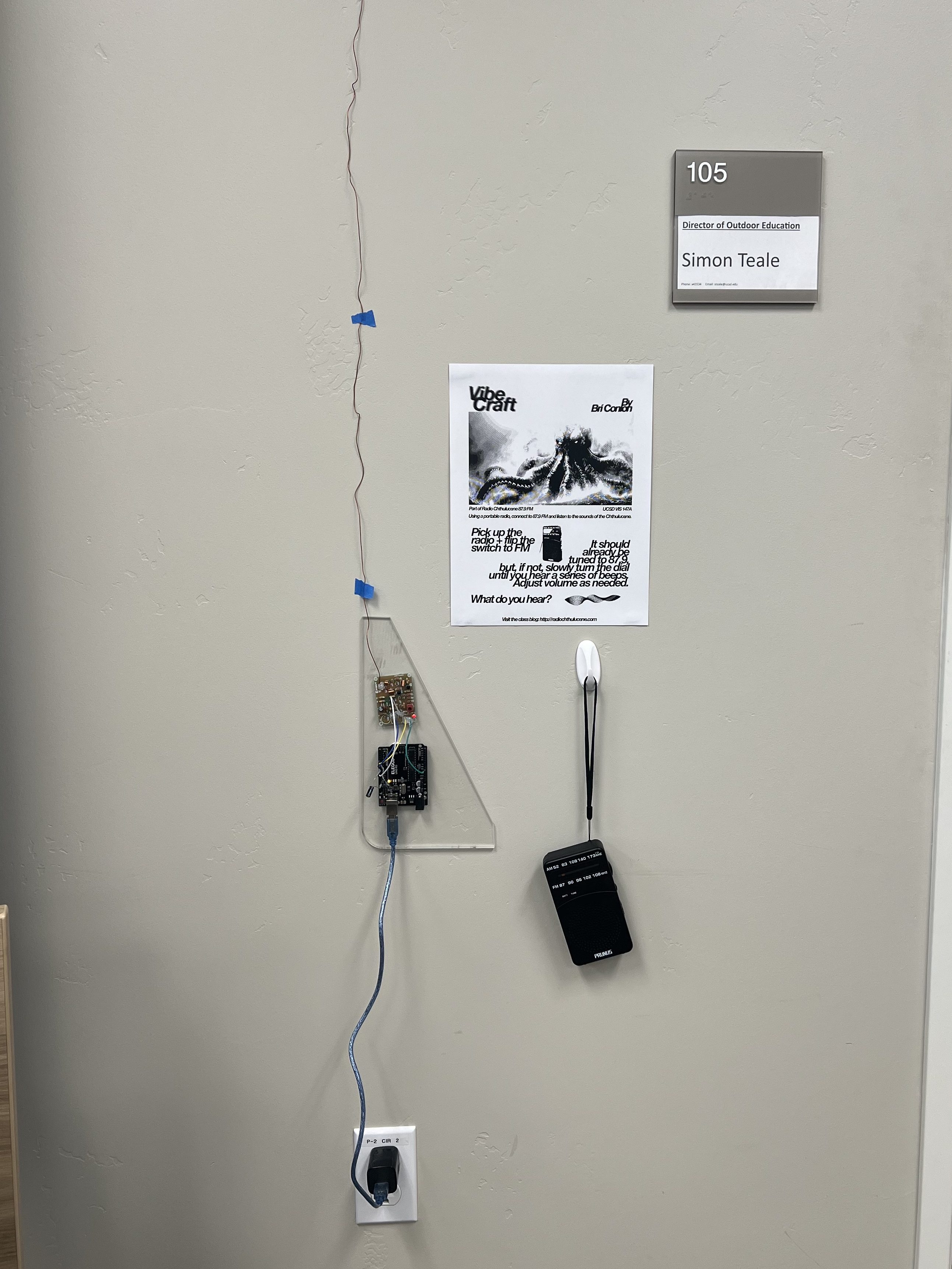 I stationed this radio transmitter at Outback Adventures on the Northernmost point of campus. This is where I work, and I wanted my project’s impact to be a fun and playful experience just like it had been when I was building it. My vision for this piece was to program different music and themes throughout the week, having my coworkers get the chance to listen to the piece on a portable radio stationed next to it and guess the songs as they changed. It was incredibly rewarding to get to see people’s reaction to hearing my programming playing on the radio as well as having fun with figuring out the pieces that played. Ultimately, my radio station is a celebration of sound and its profound impact on our lives. It is a space where voices are heard, stories are shared, and music becomes a universal language.